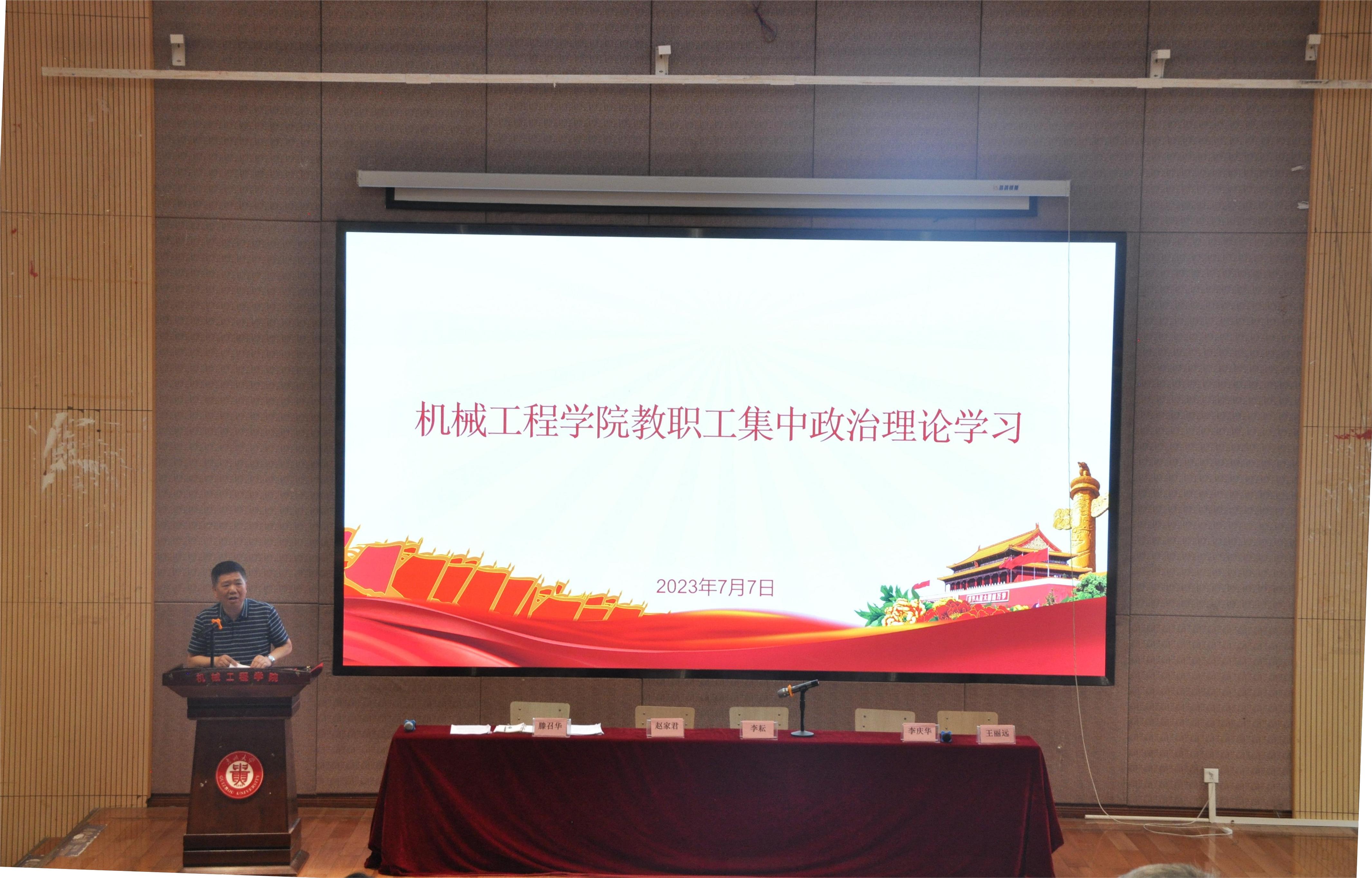 機械工程網站訊(記者 劉仕迪|攝影 陳偉)為深入學習宣傳貫徹黨的二十大精神,將習近平新時代中國特色社會主義思想學習成效轉化為推進學院高質量發(fā)展的強大動力。機械工程學院于2023年7月7日在西校區(qū)機械樓圓形報告廳召開了教職工集中政治理論學習會議。學院黨委書記滕召華、院長趙津、正處級組織員董蔚然、黨委副書記廖燁、副院長李家春出席會議,學院全體教職工參加。會議由學院黨委書記滕召華主持。