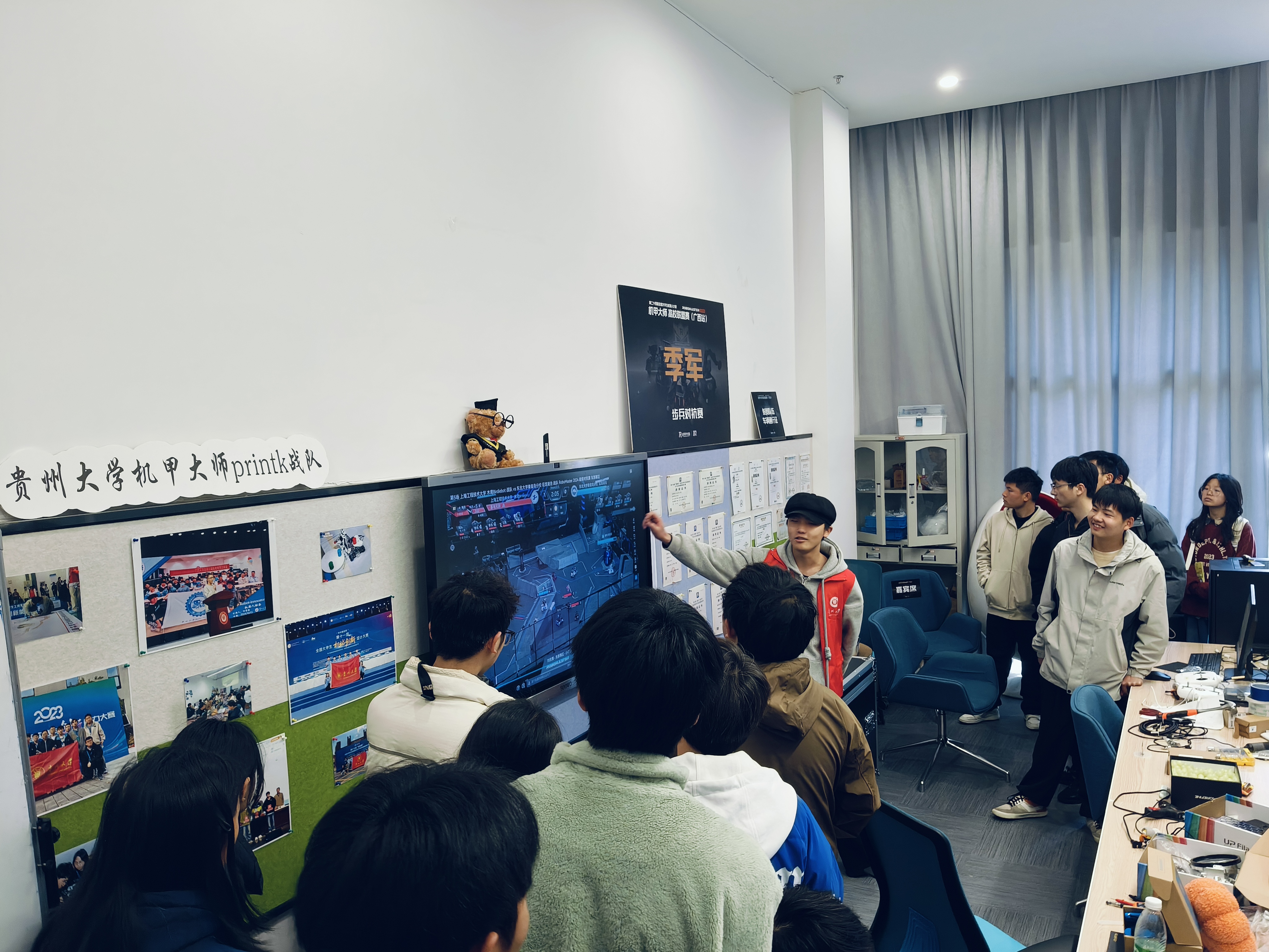 正式介紹優(yōu)秀作品前,馭想俱樂部負責(zé)人楊春白雪向同學(xué)們介紹習(xí)近平總書記給中國國際大學(xué)生創(chuàng)新大賽參賽學(xué)生代表回信內(nèi)容。隨后楊春白雪和機器人社團負責(zé)人田景怡分別對兩個科創(chuàng)社團進行了介紹并對相關(guān)賽事進行解讀,還向大家展示了貴州大學(xué)代表隊的獲獎作品。在參觀robomaster工作室時,獎杯墻令人震撼。同學(xué)們表示一個個獎杯背后的故事更令人欽佩,激勵機械青年守正創(chuàng)新,再創(chuàng)佳績。