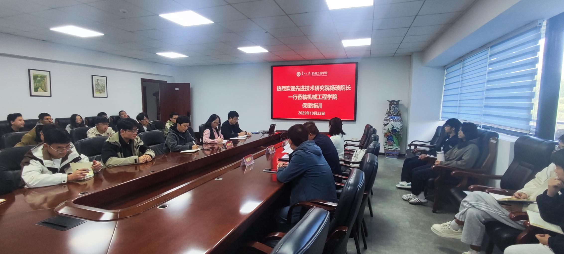 為全面貫徹總體國(guó)家安全觀(guān),加強(qiáng)保密法治建設(shè),切實(shí)提升師生的保密意識(shí)和防范能力,2025年10月22日下午14:30,機(jī)械工程學(xué)院特邀先進(jìn)技術(shù)研究院楊玻院長(zhǎng)一行蒞臨學(xué)院,開(kāi)展了一場(chǎng)主題鮮明、內(nèi)容深刻的保密專(zhuān)題培訓(xùn)。本次培訓(xùn)由機(jī)械工程學(xué)院董蔚然正處級(jí)組織員主持,學(xué)院相關(guān)領(lǐng)導(dǎo)、教師及課題組的同學(xué)們參加了本次培訓(xùn)。